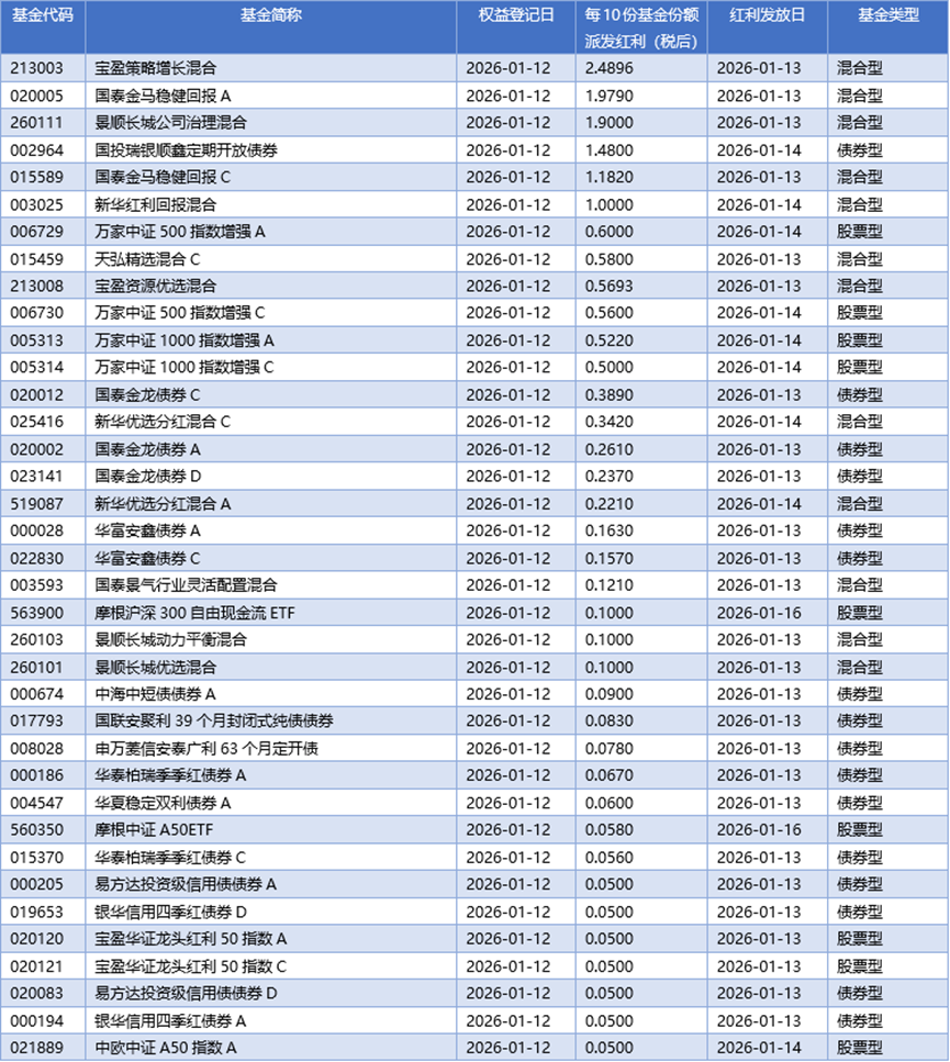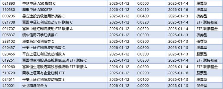 四、01月12日基金分红一览