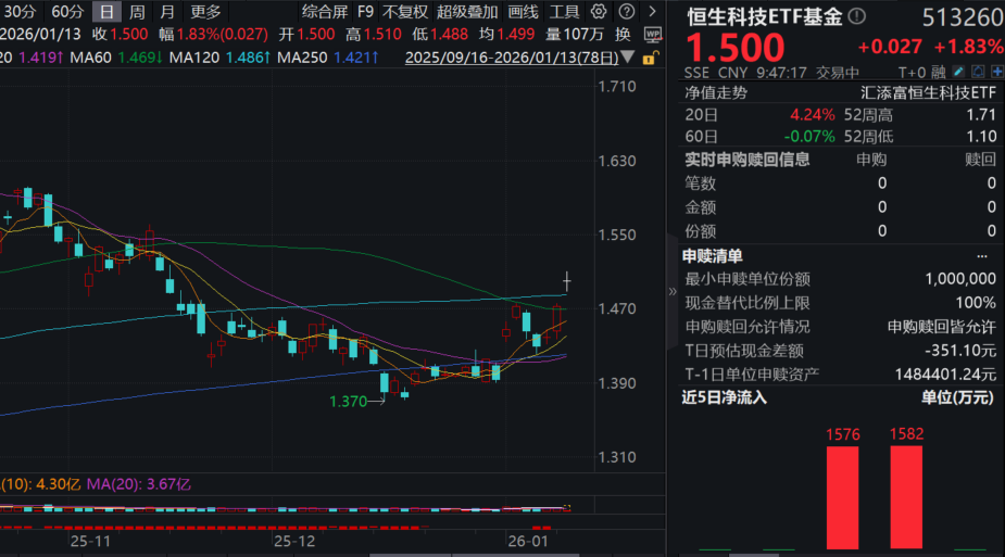 同类唯一15BP最低档管理费的恒生科技ETF基金(513260)亦涨近2%,盘中成交额已超1.6亿元。资金面上,近20日有9日获资金青睐,累计净流入超1.8亿元,基金最新融资余额再度攀升至超1.4亿元,最新规模达76亿元!