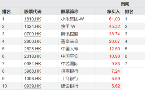 南向资金持续流入港股。近七日以来,小米集团-W以61亿港元的净买入位居榜首,快手-W、腾讯控股、中芯国际也均位于净买入榜前十。