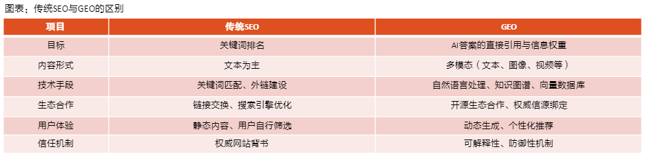 天风证券指出,GEO是生成式引擎优化(generative engine optimization,GEO),是一种针对生成式AI平台(如ChatGPT、DeepSeek、豆包等)的优化策略。GEO是SEO在AI时代的新进化,核心是通过自然语言语义优化、结构化数据适配、权威知识库构建等技术手段,适配AI算法对内容的理解、抓取和引用逻辑,使内容成为AI“首选信源”,在对话式搜索、智能问答等场景中抢占流量入口,提升品牌/内容在AI生成答案中的可见性、权威性和精准触达能力。GEO是SEO在AI时代的新进化,其不再局限于传统的关键词优化和链接建设,而是更加注重内容与AI模型之间的深度交互和理解。