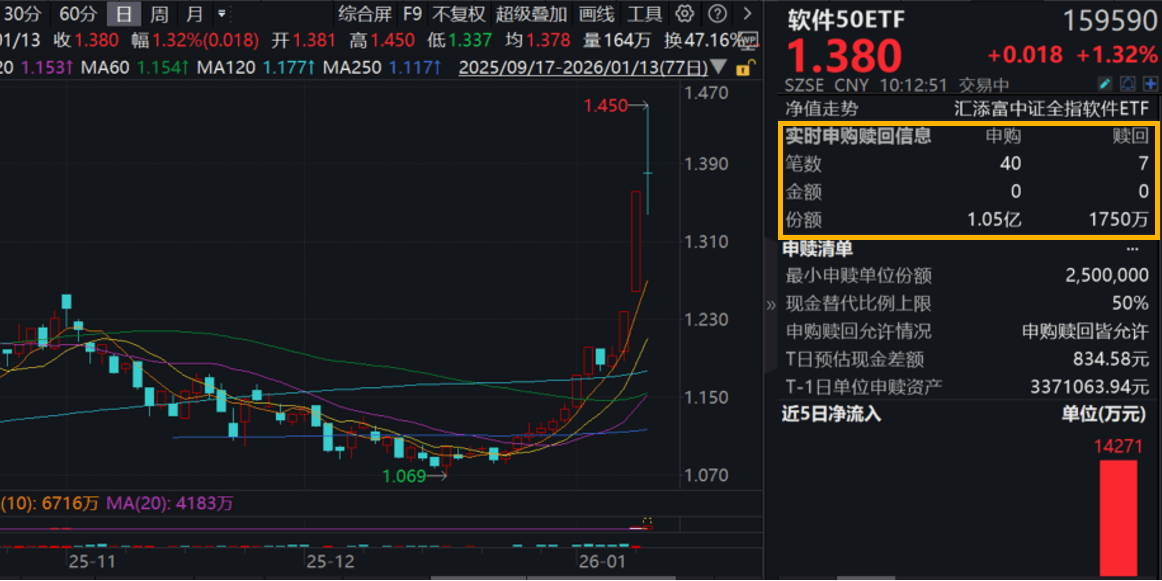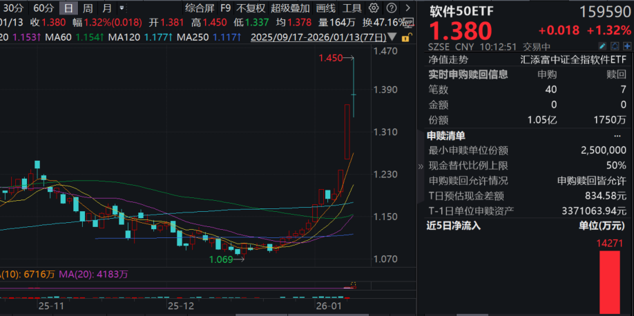 今日(1.13),A股软件持续火热,软件50ETF(159590)深V反弹涨超1.3%,资金快速涌入,昨日大举揽金1.43亿元,今日盘中再度“吸金”超1.2亿元!