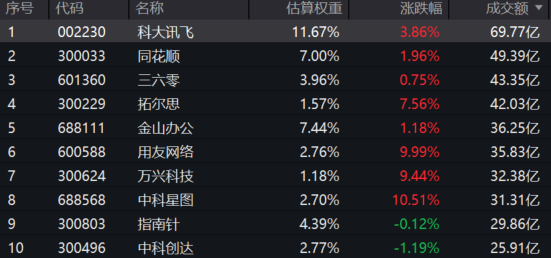 软件50ETF(159590)热门成分股多数飘红:中科星图涨超10%,用友网络涨停,万兴科技涨超9%,拓尔思涨超7%,科大讯飞涨超3%,同花顺、金山办公涨超1%。