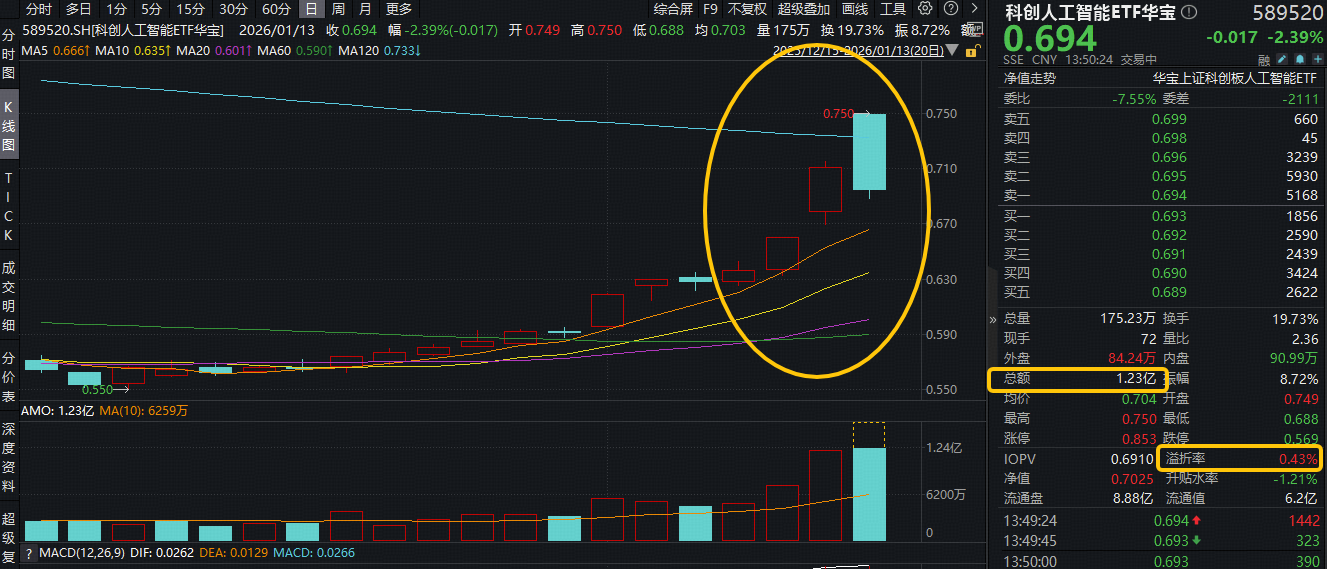 倒车接人?今日(1月13日)重点布局国产AI产业链的科创人工智能ETF华宝(589520)早盘再创上市新高后回调,场内价格现跌2.39%,实时成交额超1.2亿元,交投火热!