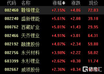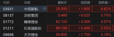 港、A股锂电池板块持续走强。A股中,赣锋锂业涨超7%,盛新锂能、西藏矿业涨超5%;港股中,中创新航涨超6%,洪桥集团、赣锋锂业涨超5%,天齐锂业涨超3%。