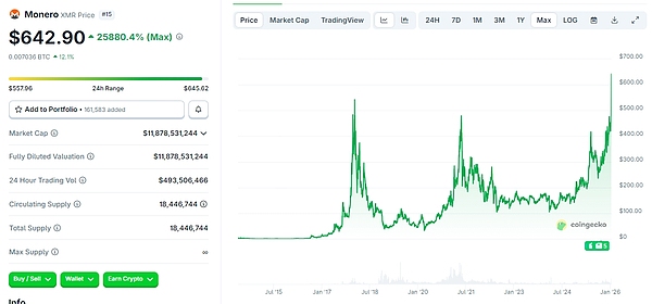 2026年1月13日,门罗币XMR新高,最高达645.47美元的历史高点,截至发稿仍处价格高点,报642.90美元。XMR自11日起开始有上涨趋势,据CoinGecko数据显示,XMR 7日涨幅43.8%。XMR行情走势在最近的加密市场整体震荡行情中,表现十分亮眼。
