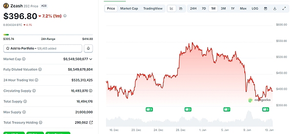 受此消息影响,ZEC价格从最高近550美元跌至最低375美元左右的低点。截至发稿报396.80美元,7日跌幅21.9%。