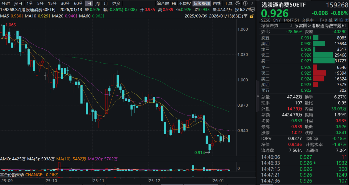 港股方面,港股通消费50ETF(159268)跌0.86%。热门成分股多数回调,泡泡玛特、老铺黄金跌超3%,李宁、美的集团、中国中免跌超2%;上涨方面,安踏体育、海尔智家微涨(标的指数成分股仅做展示,不作为个股推介)。