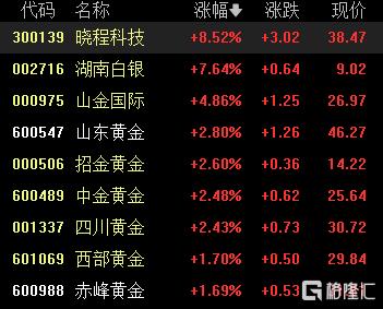 贵金属股走强,晓程科技涨超8%,湖南白银涨超7%,山金国际涨超4%,山东黄金、招金黄金等跟涨。