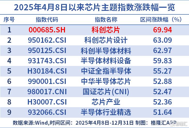 自2025年4月8日低点以来,截至2025年12月31日,科创芯片指数累计涨幅高达69.94%,跑赢中证全指半导体(55.27%)、国证芯片(52.47%)、芯片产业(52.36%),体现其高弹性特征。