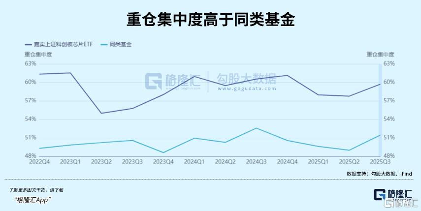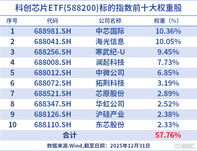 前十大重仓股权重合计占比高达57%,囊括了中芯国际(晶圆代工龙头)、海光信息(国产CPU领军者)、寒武纪(AI算力芯片先锋)、中微公司(刻蚀设备巨头)以及澜起科技(内存接口芯片龙头)等行业中流砥柱。