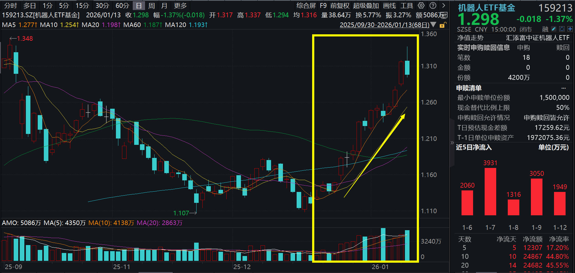 1月13日,A股市场震荡回调,沪指回调,止步17连阳。截至15:00,机器人ETF基金(159213)收跌1.37%,资金持续涌入机器人板块,机器人ETF基金(159213)全天吸金超5500万元,加上今日已连续11日强势吸金超3亿元。