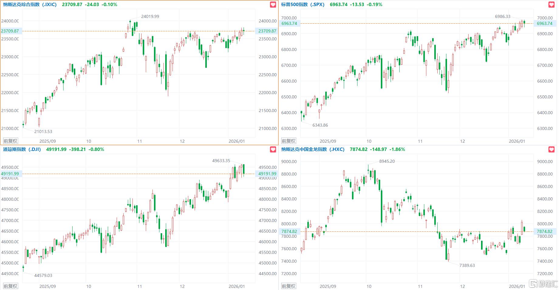 1、美股三大指数集体收跌,英特尔涨超7%,中概指数跌1.86%;