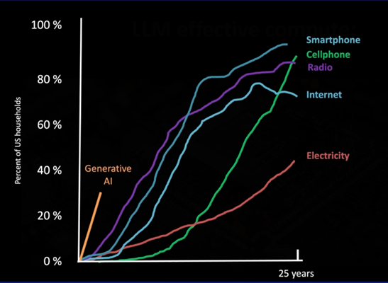 回顾人类历史上电力、互联网等关键技术的渗透曲线,AI的扩散速度史无前例:生成式AI(Generative AI)在2022年前后实现商业化突破,目前的渗透率已超过30%,是全球范围内普及最快的技术形态之一。