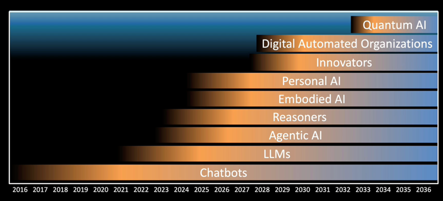 从简单文字反馈的聊天机器人,到大语言模型、代理式AI,再到推理型AI、具身智能、创新型AI,AI的演进呈现出“专家协作系统”的模式。