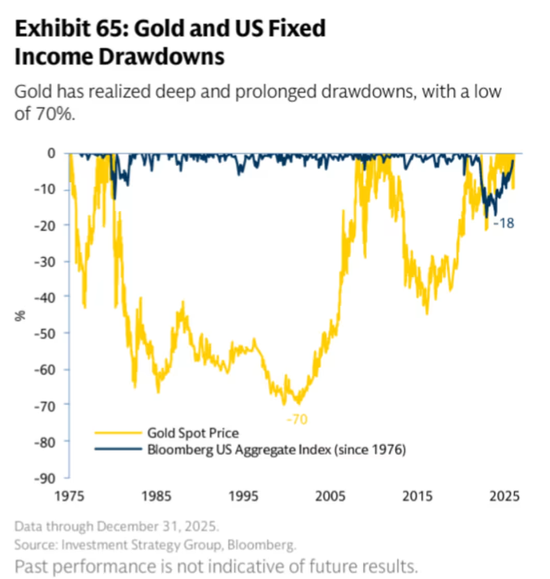 在其2026年展望报告中,高盛财富管理业务的投资策略团队警告称,“黄金在历史上出现过深度且持续的回撤,其最大回撤幅度达70%。”下图通过与作为动荡时期投资组合传统缓冲垫的美国债券市场进行对比,清晰地展示了这一点。