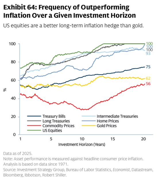高盛投资策略团队的战术资产配置主管布雷特·纳尔逊(Brett Nelson)在有关2026年展望的媒体简报会上表示,从历史数据看,“黄金的波动性高于美国股票,回撤幅度也大得多,并且仅在约半数20年滚动周期中对冲通胀有效”——即产生实际回报。
