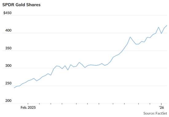该ETF在2025年飙升近64%之后,今年继续上涨,创下自2004年底推出以来最强劲的年度涨幅。根据FactSet的数据,该基金去年的飙升远超其之前最大的年度涨幅,即2007年逾30%的涨幅。