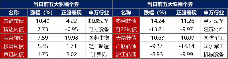 【转债市场主要指数集体跟跌】 1月13日,转债市场跟随权益市场有所回调扬,中证转债、上证转债、深证转债分别收跌1.10%、0.97%、1.32%。转债市场成交额1038.44亿元,较前一交易日缩量46.30亿元。当日转债市场个券多数下跌,385支转债中,47支收涨,327支下跌,11支持平。当日上涨个券中,泰福转债涨超10%,精达转债、宝莱转债涨超7%;下跌个券中,崧盛转债跌逾14%,再22转债跌逾13%。