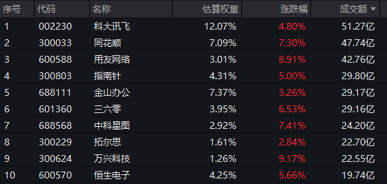 软件50ETF(159590)热门成分股多数大涨:用友网络涨超8%,同花顺、中科星图涨超7%,三六零涨超6%,指南针涨5%,科大讯飞涨超4%。