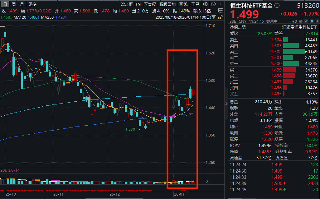 今日(1.14),港股科技持续火爆,100%纯度的港股通科技30ETF(520980)大涨近3%,盘中已放量成交3亿元!资金面上,近4日有2日获资金关注,累计“吸金”超4100万元!
