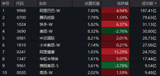 港股科技热门股中,阿里健康暴涨超15%,快手-W涨超6%,阿里巴巴-W涨近5%,中芯国际涨超2%,腾讯控股涨超1%。
