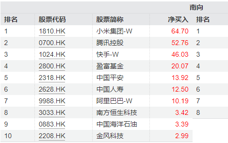 南向资金持续流入港股。近七日以来,小米集团-W以64.7亿港元的净买入位居榜首,腾讯控股、快手-W、阿里巴巴-W也均位于净买入榜前十。