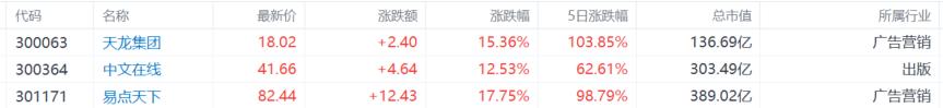 新“易中天”继续冲锋。易点天下、中文在线、天龙集团现分别涨超17%、12%、15%。