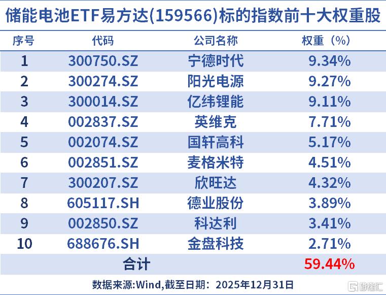 反映在资本市场上,这些核心巨头的经营业绩强劲发展势能,也让储能板块在资本市场表现在一众硬科技赛道中脱颖而出,2025年,国证新能源电池指数强势上涨55.15%,显著跑赢多数行业。跟踪这一指数的储能电池ETF易方达(159566)实现量价齐涨,全年强势上涨57.96%。