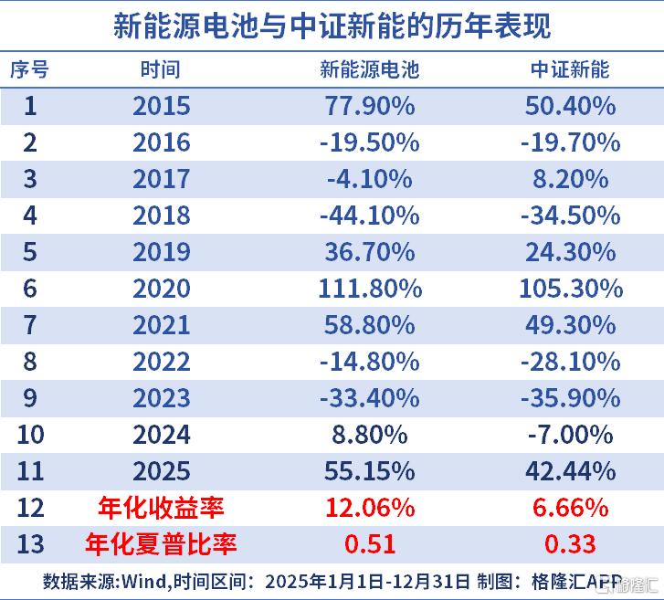 历史业绩来看,储能电池ETF跟踪的新能源电池指数近10年的年化收益12%,夏普比率为0.5,均优于中证新能指数,超额优势显著,本轮修复行情中弹性也明显更高。