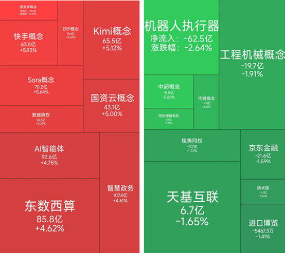 1月14日,A股三大指数冲高回落。截至收盘,沪指跌0.31%报4126.09点;深成指涨0.56%报14248.6点;创业板指涨0.82%报3349.14点。从板块行情上来看,今日表现较好的是拼多多概念、AI智能体和东数西算,而工程机械概念、机器人执行器和天基互联等板块下跌