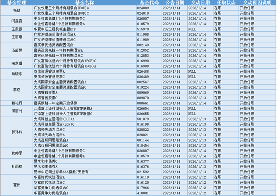 基金经理是一只基金产品最核心的成员,能决定一只基金的投资方向、投资策略以及投资风格,基金经理出色的择时选股能力和调研预测能力是基金业绩的有力保证,所以基金经理是投资者在选择基金产品时的重要依据。基金经理的变动很大程度上会影响到基金产品未来的表现,是一个需要特别关注的信息。1.14日共有18位基金经理发生任职变动。