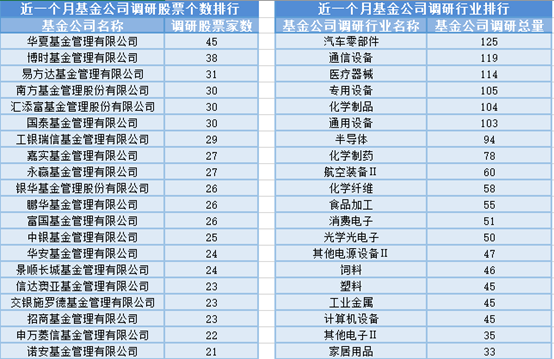 近一个月(12月15日-1月14日),华夏基金参与公司调研的数量最多,共调研45家上市公司,此外调研较为活跃的还有博时基金、易方达基金和南方基金,分别调研38家、31家、30家上市公司;从调研行业上来看,基金公司对汽车零部件行业的上市公司调研次数最多,共有125次,其次是通信设备行业,基金公司调研了119次。