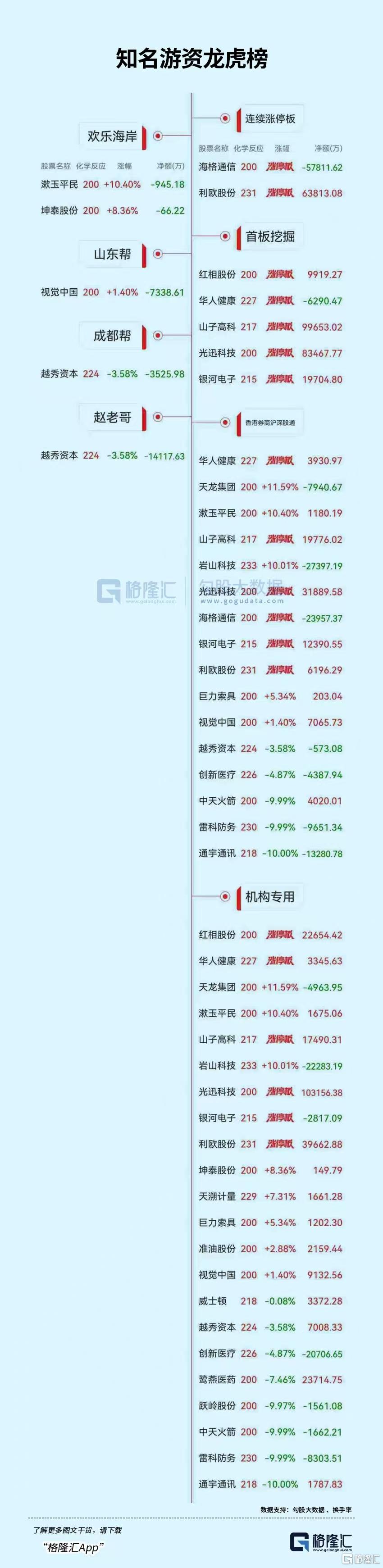 龙虎榜中涉及机构专用席位的个股中,当日净买入额前三为光迅科技、利欧股份、中国卫通,分别为5.16亿元、3.97亿元、3.46亿元。