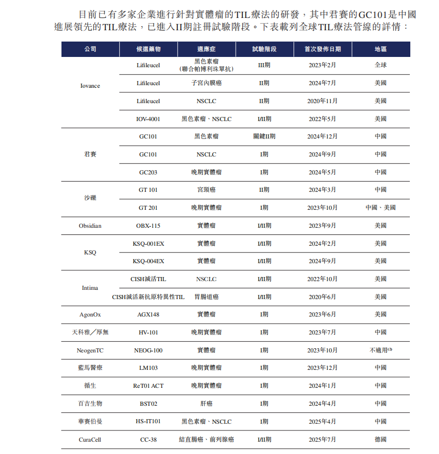 君赛生物提到,细胞疗法行业尤其是肿瘤领域,竞争激烈且发展迅速。虽然我们专注于开发高度差异化的TIL疗法,但预计将面临来自成熟跨国制药公司及正在开发基于TIL或其他过继性细胞疗法的新兴生物技术公司的激烈竞争。