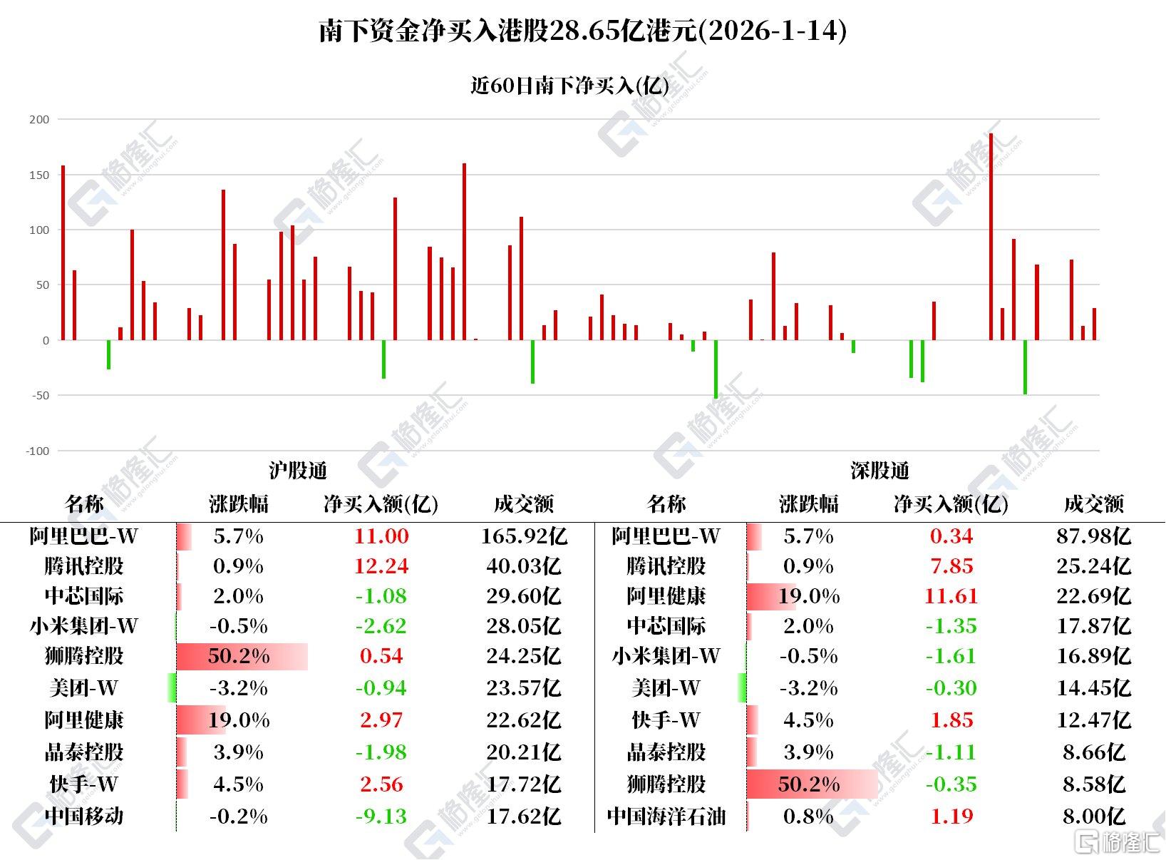 23、南下资金大幅净买入腾讯、阿里健康和阿里;