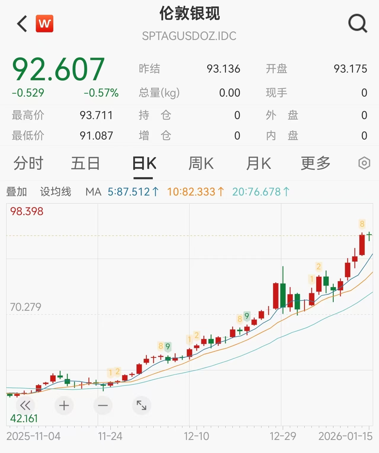值得注意的是,白银市场表现抢眼。COMEX白银期货涨5.81%,报90.86美元/盎司,盘中一度突破93美元关口,创历史新高。伦敦现货白银也涨2.11%,盘中最高至89.12美元。相比之下,黄金表现温和,COMEX黄金期货微跌0.42%。