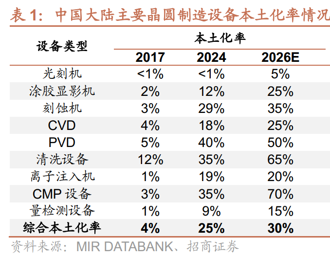 根据MIR,2024年中国晶圆制造设备综合本土化率25%,其中光刻机、量检测设备、涂胶显影机的国产化率较低,分别为<1%、9%、12%;MIR预测到2026年,中国晶圆制造设备综合本土化率有望提升至30%。
