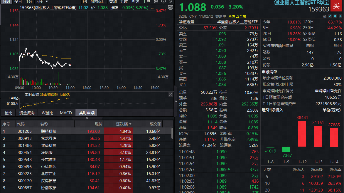 热门ETF方面,双线布局“算力 AI应用”的创业板人工智能ETF(159363)场内价格大跌3%,成交额超5亿元,资金继续进场抢筹,实时净申购1.4亿份,此前3日已累计加码9.7亿元。