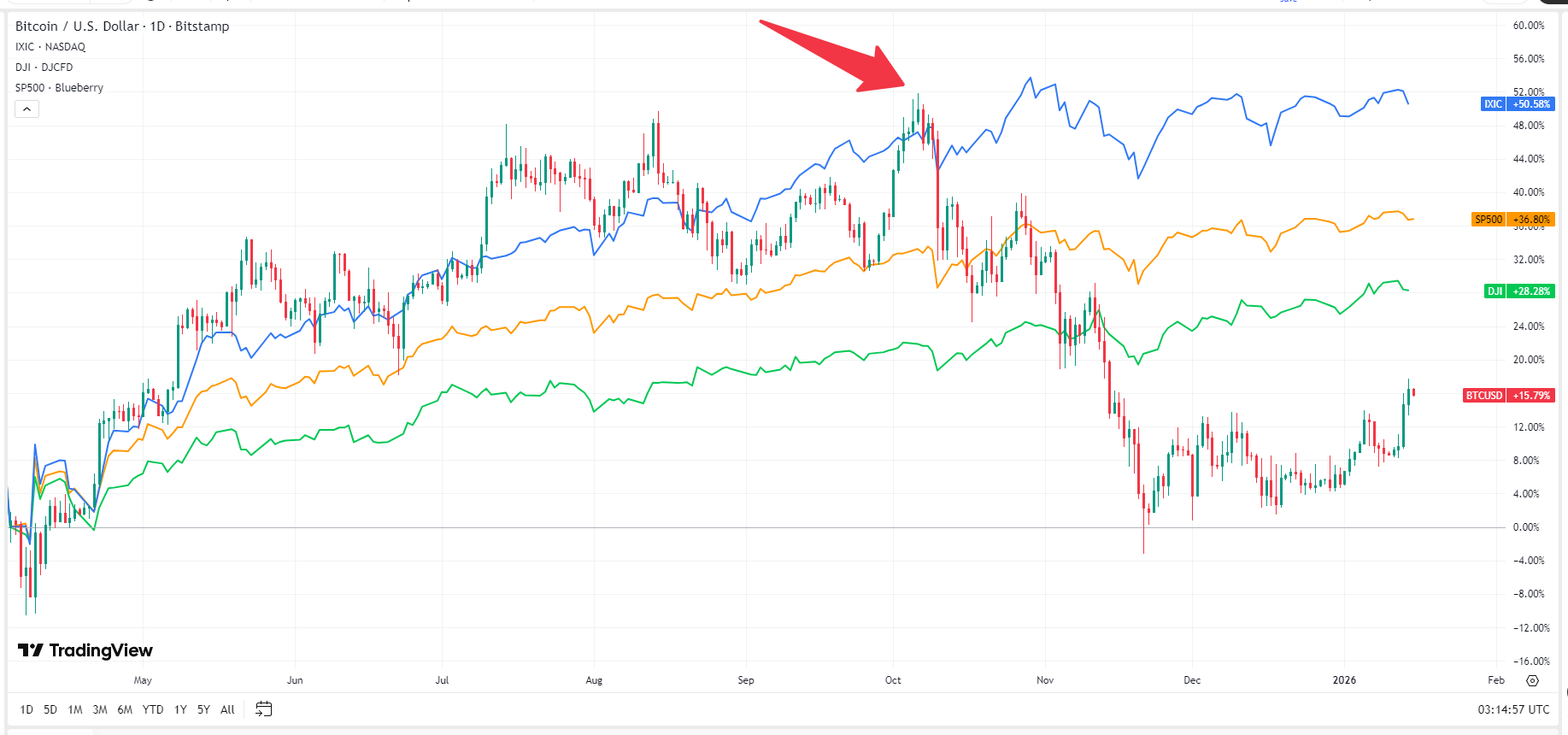 2025年10月之后,比特币与美股相关性逐渐下降,走势出现明显的分化。其中,纳指维持高位盘整,道指与标普500相继攀升创新高,而比特币价格持续回调。11月21日之后,比特币价格触底反弹,总体趋势与美股三大指数再次保持一致。
