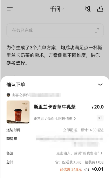 经实测发现,平日售价20元/杯的奶茶,通过千问App下单仅需1分钱。(注:为功能新上线价格,并非长期有效)