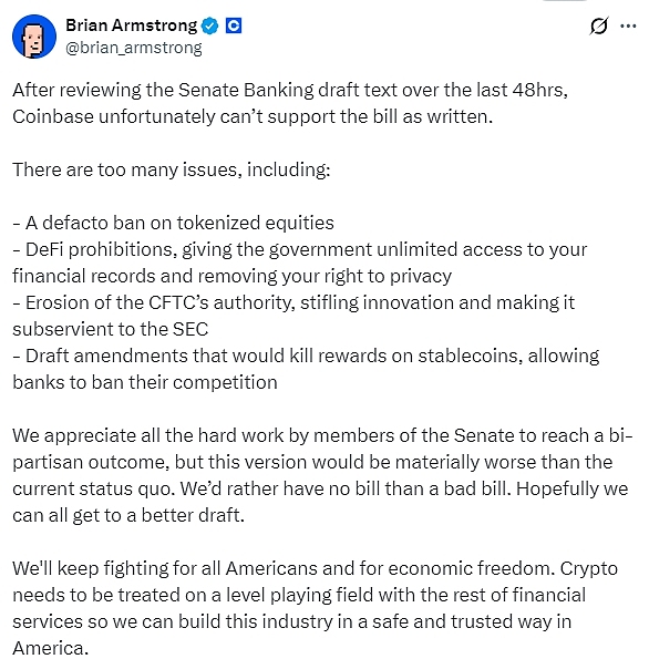 Coinbase 首席执行官 Brian Armstrong周三表示,他已经审阅了参议院银行法案的草案文本,但“很遗憾,他无法支持该法案的现有版本”。