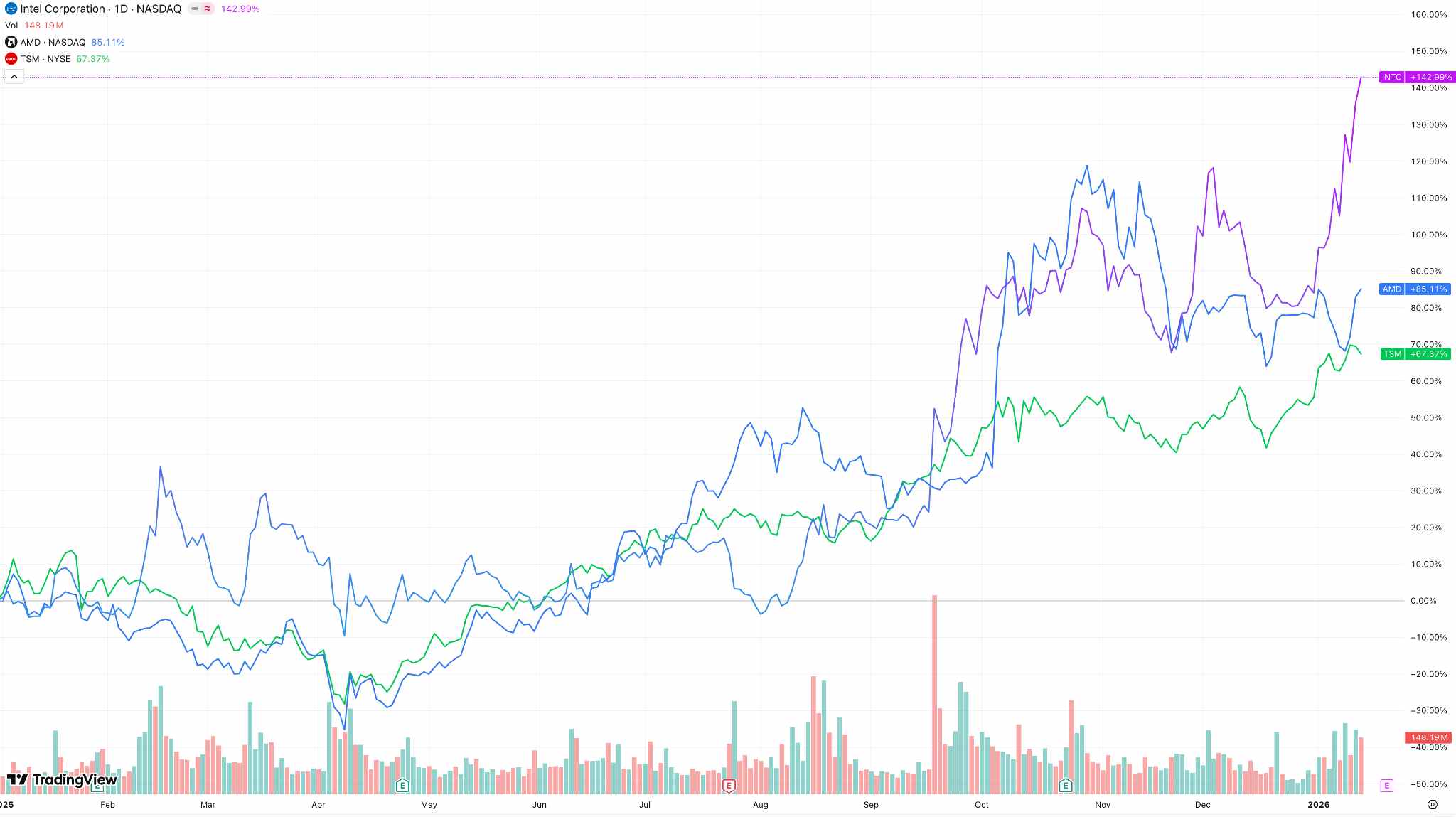 【AMD、TSM、INTC 2025年股价走势图,来源:TradingView】