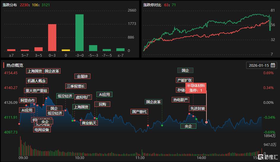 1月15日,沪深两市成交额2.91万亿,较上一个交易日缩量1.04万亿。贵金属、能源金属、电池、存储芯片、半导体等板块涨幅居前,互联网电商、AI应用、军工、商业航天等板块跌幅居前。
