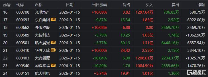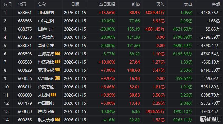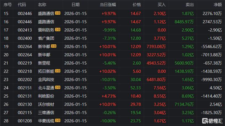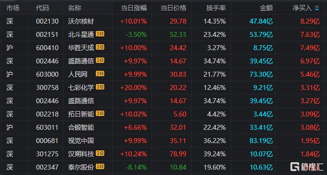 龙虎榜单日净买入额前三为沃尔核材、盛路通信、合锻智能,分别为8.29亿元、3.27亿元、3.08亿元。