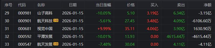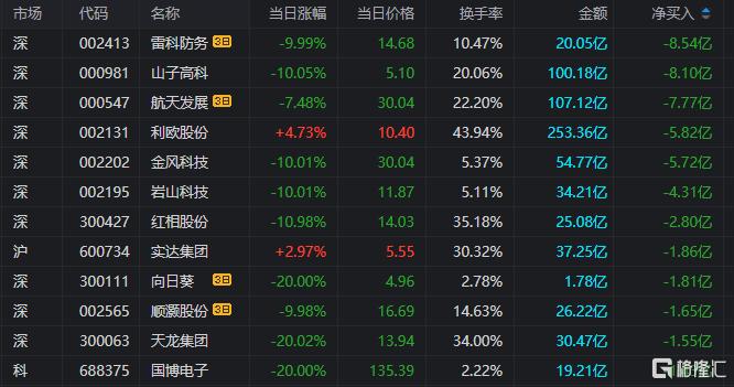 山子高科:今日跌停,全天换手率20.06%,成交额100.18亿元,振幅10.78%。龙虎榜数据显示,机构净卖出2.42亿元,深股通净卖出3.15亿元,营业部席位合计净卖出2.53亿元。