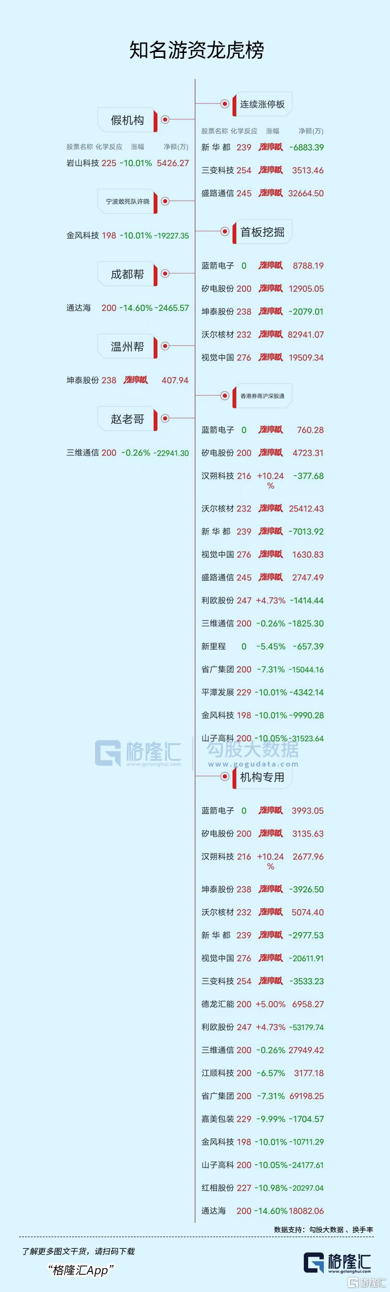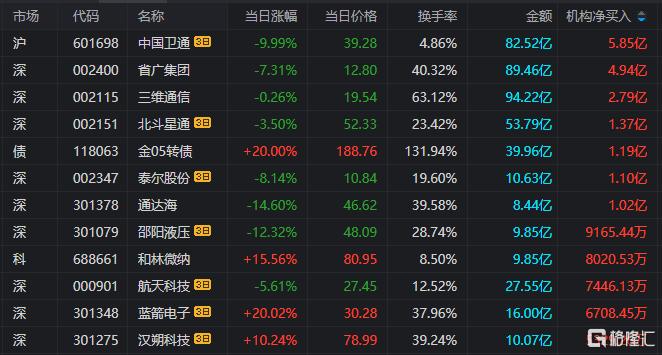 龙虎榜中涉及机构专用席位的个股中,当日净买入额前三为省广集团、三维通信、通达海,分别为4.94亿元、2.79亿元、1.02亿元。