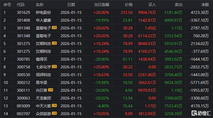 龙虎榜单日净卖出额前三为山子高科、利欧股份、金风科技,分别为8.10亿元、5.82亿元、5.72亿元。