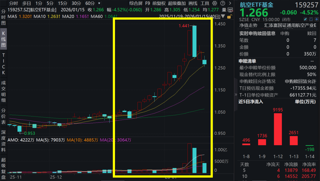 1月15日,A股市场震荡,商业航天板块再度回调。截至15:00,航空ETF基金(159257)缩量下跌4.52%。