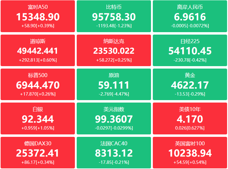 外盘:芯片股及银行股强势领涨,美股终结两日连跌走势,其中道指涨292.81点,涨幅0.60%报49442.44点;纳指涨58.27点,涨幅0.25%报23530.02点;标普500涨17.87点,涨幅0.26%报6944.47点。阿斯麦涨超5%,台积电涨超4%,英伟达涨超2%;贝莱德、摩根士丹利涨超5%,高盛、花旗涨超4%;中概股多数下跌,纳斯达克中国金龙指数跌0.6%,网易、携程、有道跌超2%,京东跌1.4%,百度跌0.7%,哔哩哔哩跌0.6%,阿里巴巴涨0.6%,理想汽车、小鹏汽车、蔚来涨超1%。