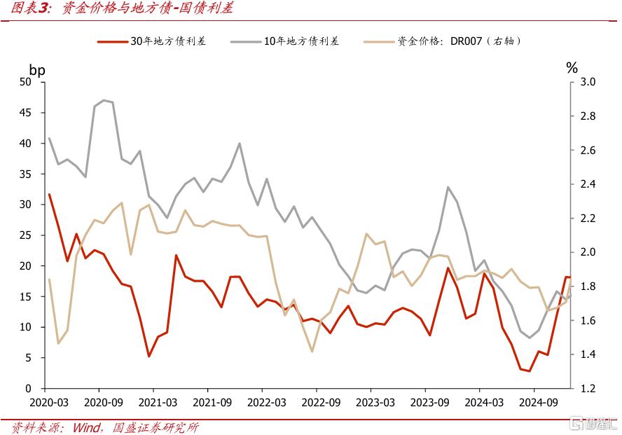 短期资金成本也是影响地方债-国债利差的因素之一。DR007 上行意味着短端资金成本 抬升、杠杆与滚动持债成本抬升,机构交易盘和配置盘的边际承接能力下降,因此市场 更偏好流动性更好、对冲更便利的国债,地方债需提供更高风险与流动性补偿,从而使 得地方债-国债利差走阔。反之,DR007 下降则推动地方债-国债利差收窄。从历史走势 看,资金价格与地方债利差在多段时期呈现较为一致的方向。